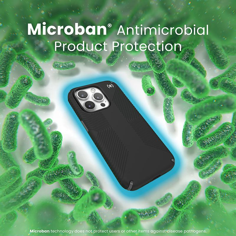 The original Speck protective case from the Presidio2 Grip series also offers MICROBAN® antibacterial protection (a global leader in antimicrobial solutions with a broad portfolio of over 25 approved technologies). An active ingredient built into the case's structure stops 99% of bacteria that accumulate on its surface. MICROBAN® technology provides lifetime protection against bacteria that cause stains and odors, and works at a cellular level to keep the case clean.