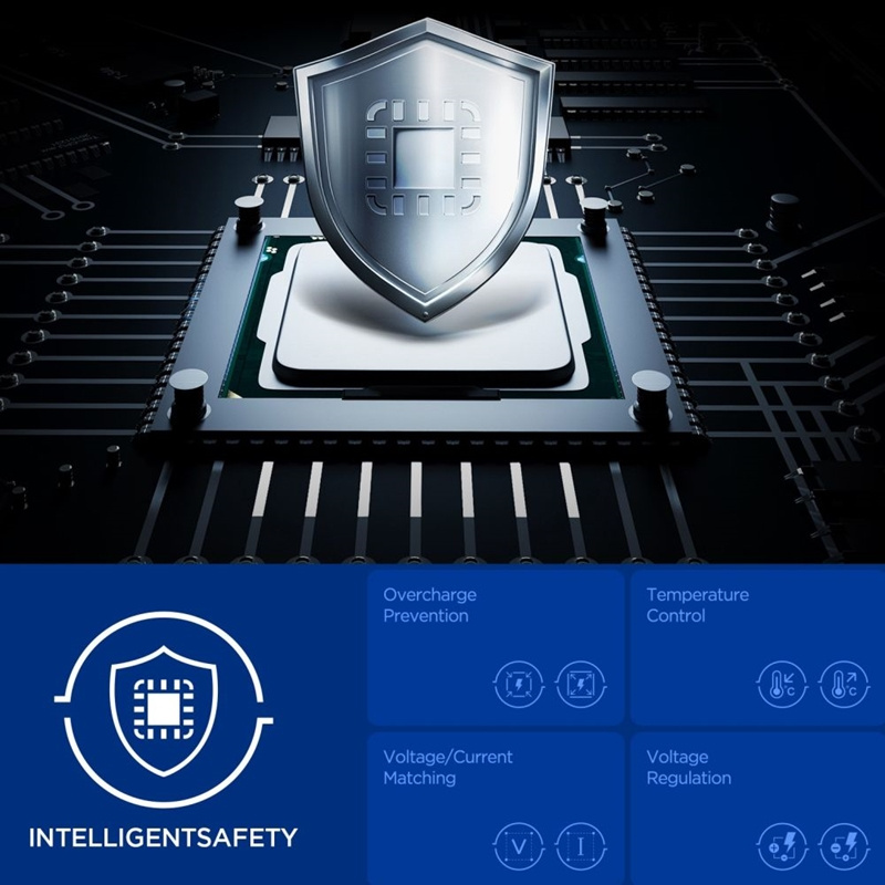 Quantum Boost technology automatically adjusts charging parameters to the connected device, maximizing efficiency and reducing charging time. Safety is ensured by a set of advanced protection systems, such as Overcharge Prevention, Voltage Matching, and Voltage Regulation, which protect your devices against overcharging, unstable voltage, and excessive current.