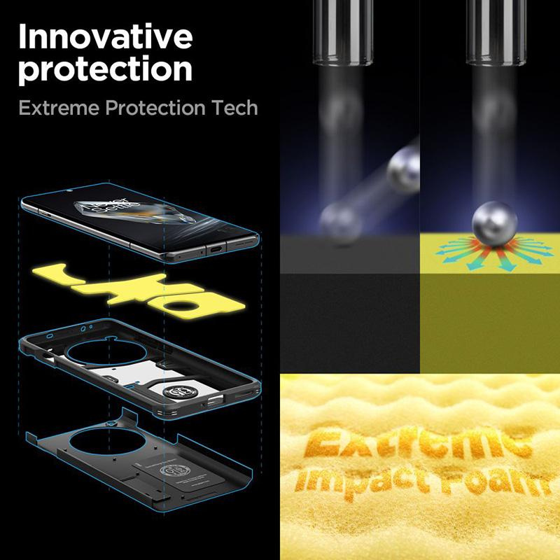 Spigen Tough Armor to hybrydowe etui, którego wewnętrzna warstwa została wykonana z trwałego i odpornego na wstrząsy elastycznego TPU, a na jego zewnętrznym panelu zastosowano twardy i wytrzymały poliwęglan. Wnętrze zostało uzupełnione cienką warstwą pianki redukującej wstrząsy. Etui jest łatwe w montażu, a jego lekko wystające krawędzie chronią kamerę i ekran przed zarysowaniami na płaskich powierzchniach.