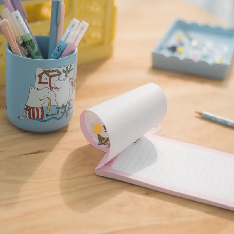 Notatnik ma wymiary 10 × 21 cm i zawiera 65 odrywalnych kartek, a w zestawie znajduje się ołówek dopasowany do motywu. Mocne magnesy zapewniają stabilność i uniemożliwiają zsuwanie się notatnika z powierzchni metalowych. Całość zdobi licencjonowana grafika Muminków inspirowana klasycznymi ilustracjami Tove Jansson, dodając uroku każdemu wnętrzu.