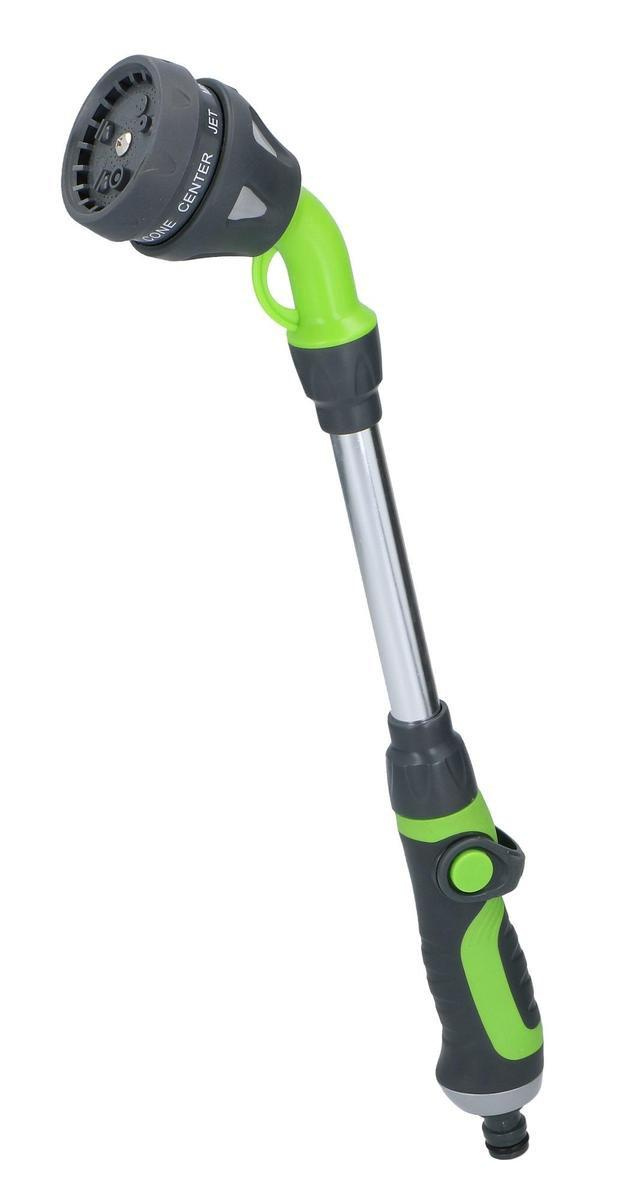 Pistolet zraszający posiada regulowaną głowicą, dzięki której istnieje możliwość ustawienia 8 rodzajów strumienia: mgiełka, płaszcz, struga, strumień centralny, prysznic, centralny.