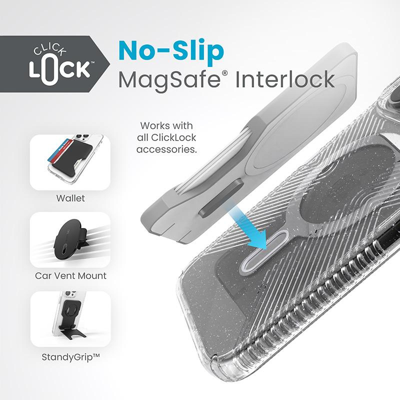 Innowacyjna technologia ClickLock™ Interlock tworzy antypoślizgową blokadę magnetyczną między etui Speck MagSafe® a wybranymi akcesoriami Speck, eliminując przypadkowy upadek urządzenia.